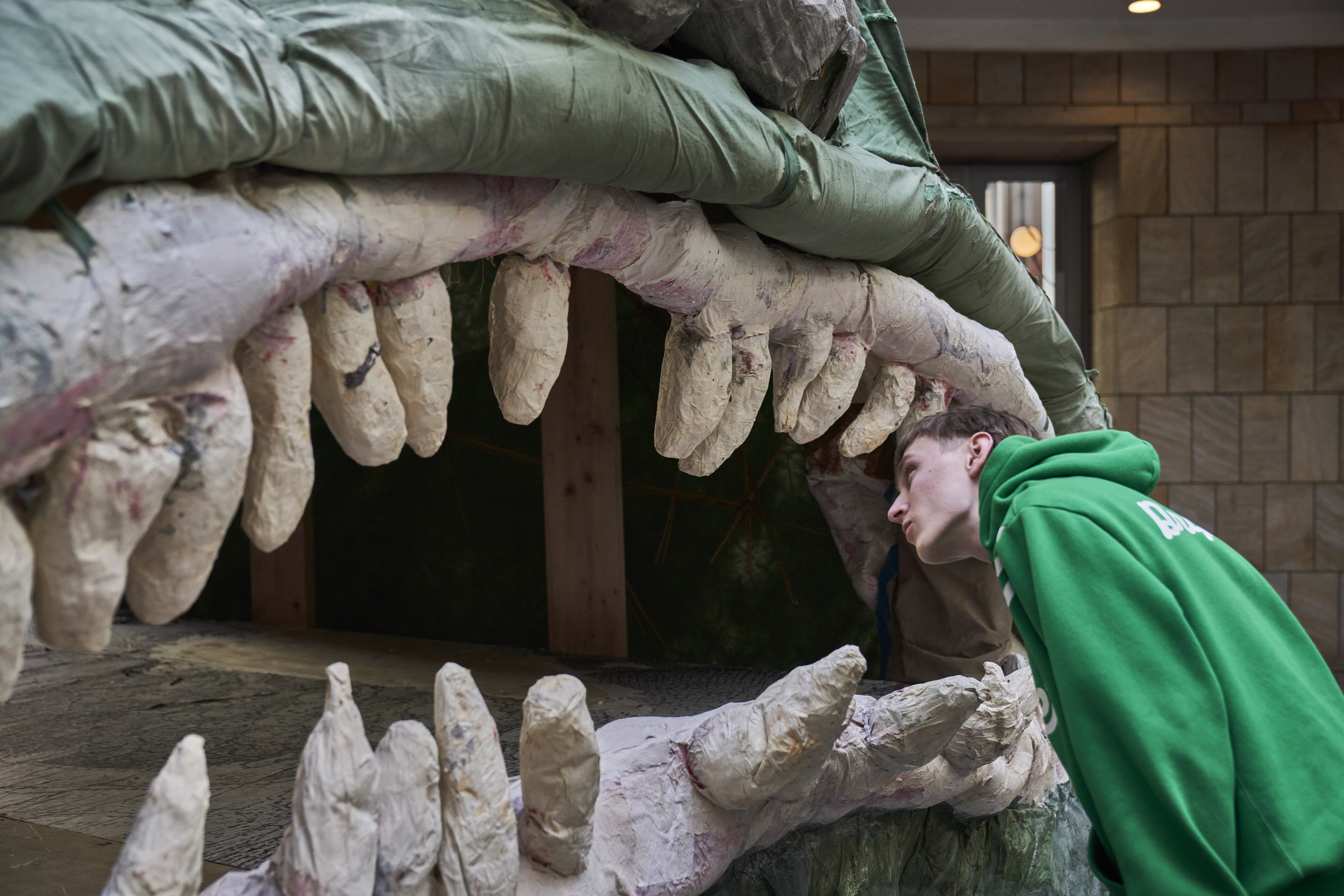 Mit ihrer Installation lässt MONSTER CHETWYND in der Rotunde die Besucher*innen durch die geöffneten Münder ihrer monströsen Heads treten