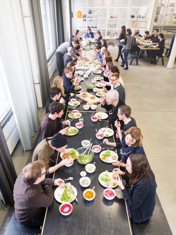 Ólafur ElÍasson (top of table) eating with staff at The Kitchen in his Berlin studio. Photograph: Thorsten Futh/The Guardian, Image via www.theguardian.com