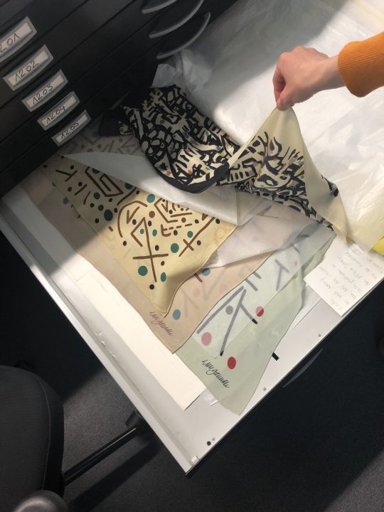 The artistic estate comprises original works by Willi Baumeister, which we keep here in the archive. That means that the archive room where we work simultaneously serves as the storeroom for the works on paper. These include not only drawings, but also prints comprising serigraphs, lithographs, and etchings. On top of this, there are designs for stage sets and typographic sketches. But Baumeister’s sketchbooks are also in the archive, along with a small but surprising collection of Baumeister’s textile designs, which he produced in the 1940s and 1950s for the Pausa company. Here, we have a small selection of neckerchiefs and decorative fabrics that Baumeister designed.