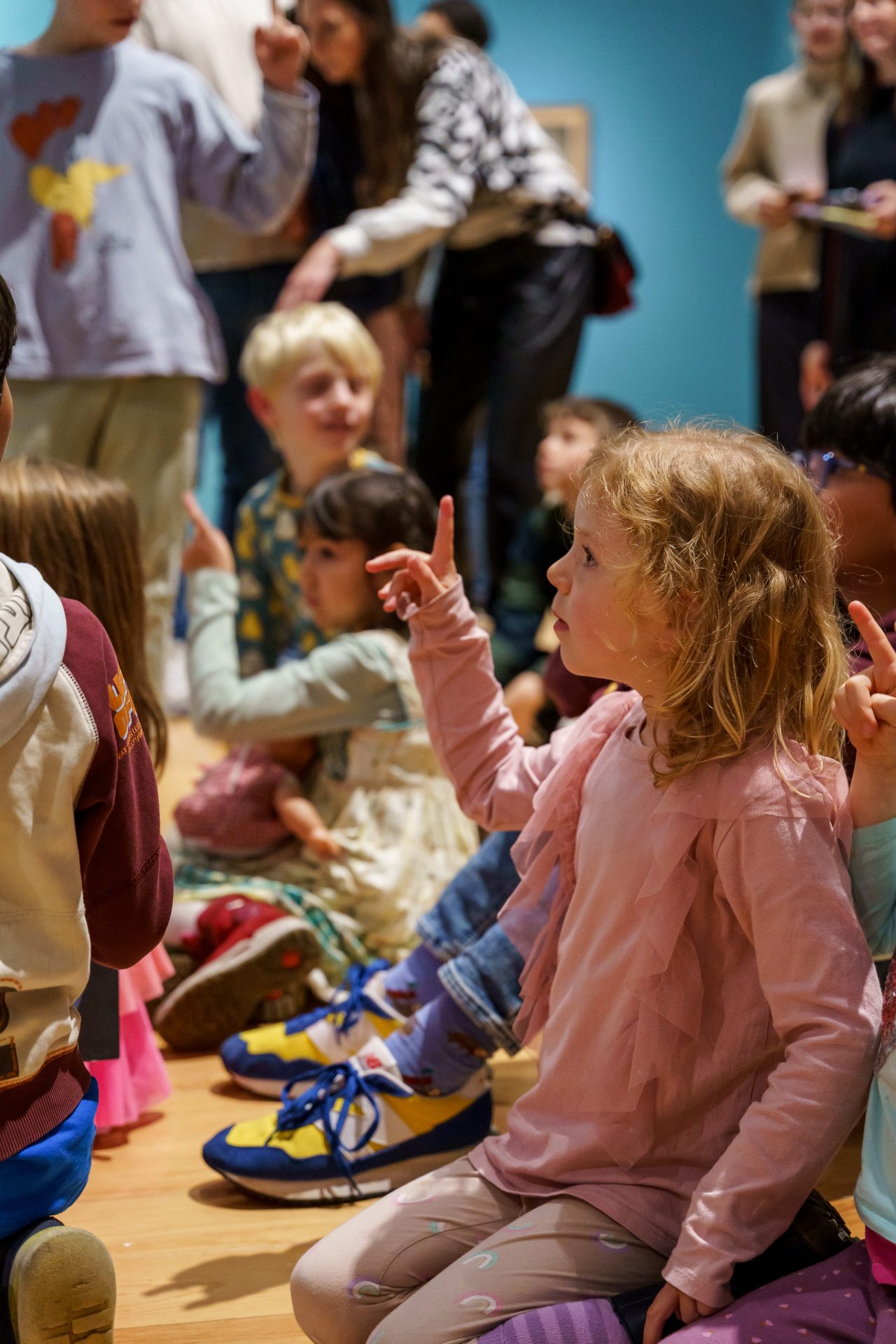 Ein kleiner Junge zeigt in einer Galerie auf Kunstwerke, während er auf den Schultern seines Vaters sitzt.