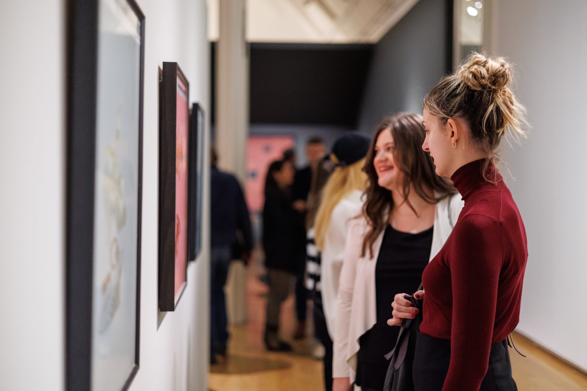 Besucher in einer Galerie betrachten Kunstwerke, während jemand sitzt und ein anderes Gespräch führt.