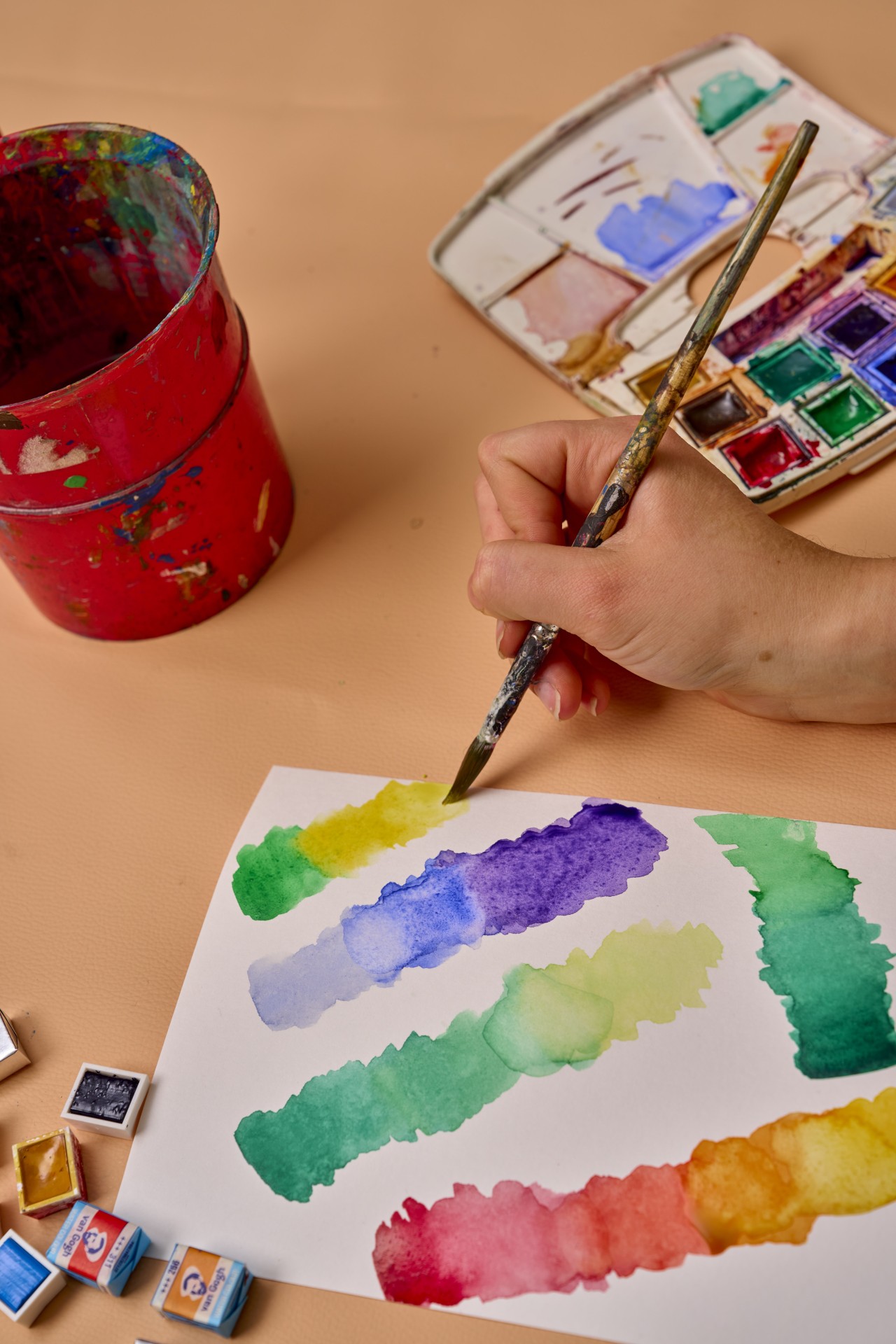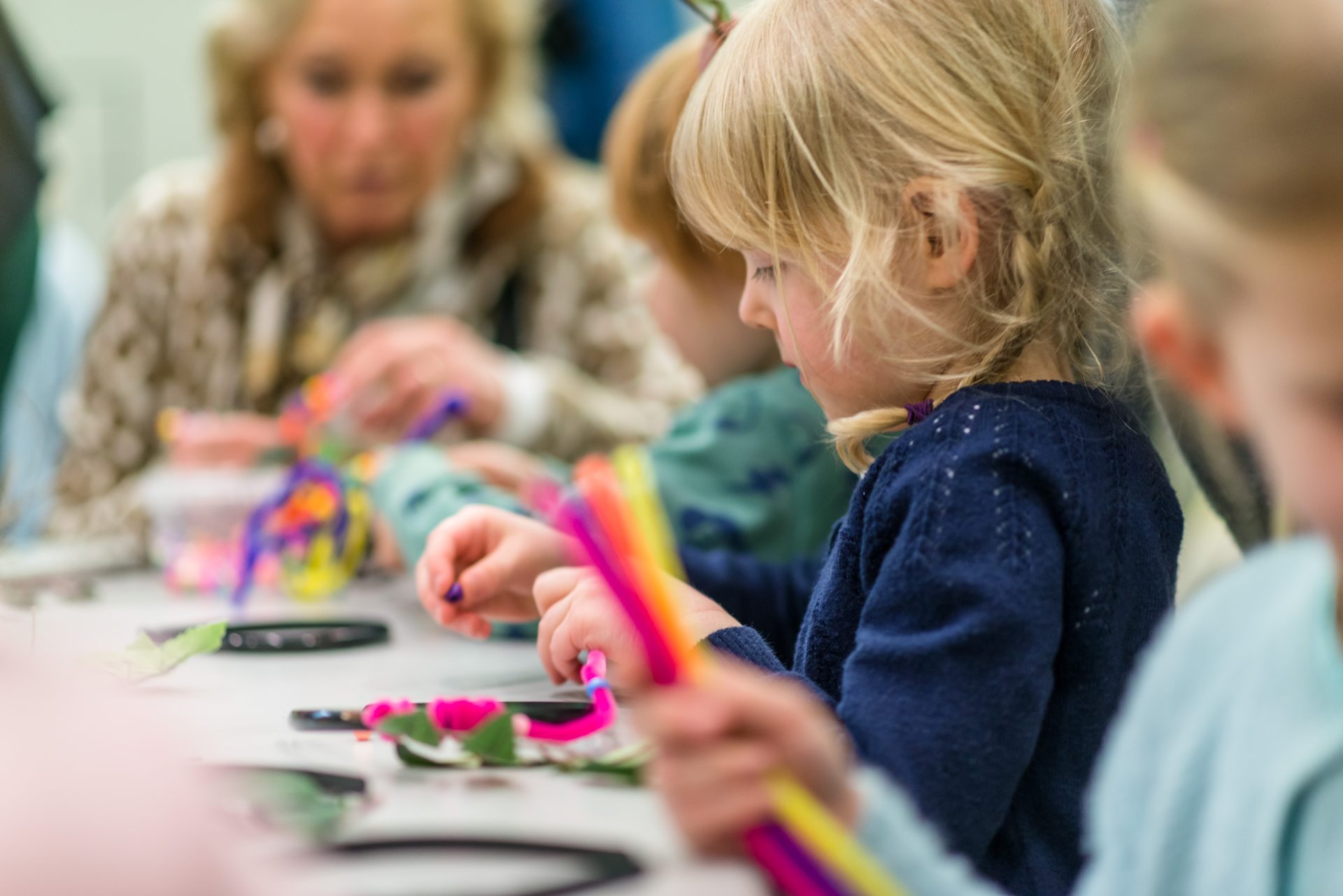 Eine Frau schneidet buntes Papier während eines kreativen Workshops an einem Tisch voller Bastelmaterialien.