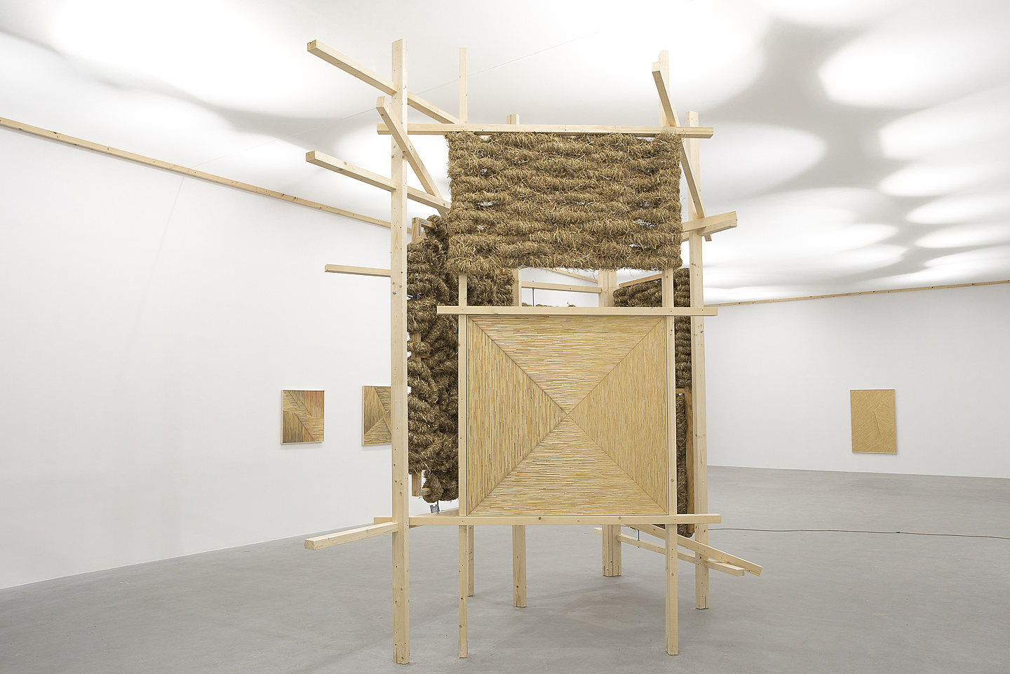 Im Gropiusbau stehen diese im Dialog mit geometrischen „Strohbildern“, die zuletzt auch prominent auf der Documenta 14 zu sehen waren und je nach Sonnenstand ihre Farbigkeit verändern. Auch in den Arbeiten der Städelschule Professorin Haegue Yang kommt Stroh zum Einsatz – wenn auch nur in artifizieller Form. „The Intermediates“, eine Serie aus handgefertigten Objekten aus künstlichem Stroh, scheinen die Bewohner einer fremden, Sci-Fi-ähnlichen Welt zu sein, in der es Knoblauch und Zwiebeln regnet, alles in Flammen steht und Operationsgeräte grüne Massen unter die Lupe nehmen. Dieses Spektakel spielt sich zumindest auf der Wandtapete „Incubation and Exhaustion“ ab, aus der die „Intermediates“ gerade entsprungen zu sein scheinen, während aus den Lautsprechern Vogelstimmen erklingen.