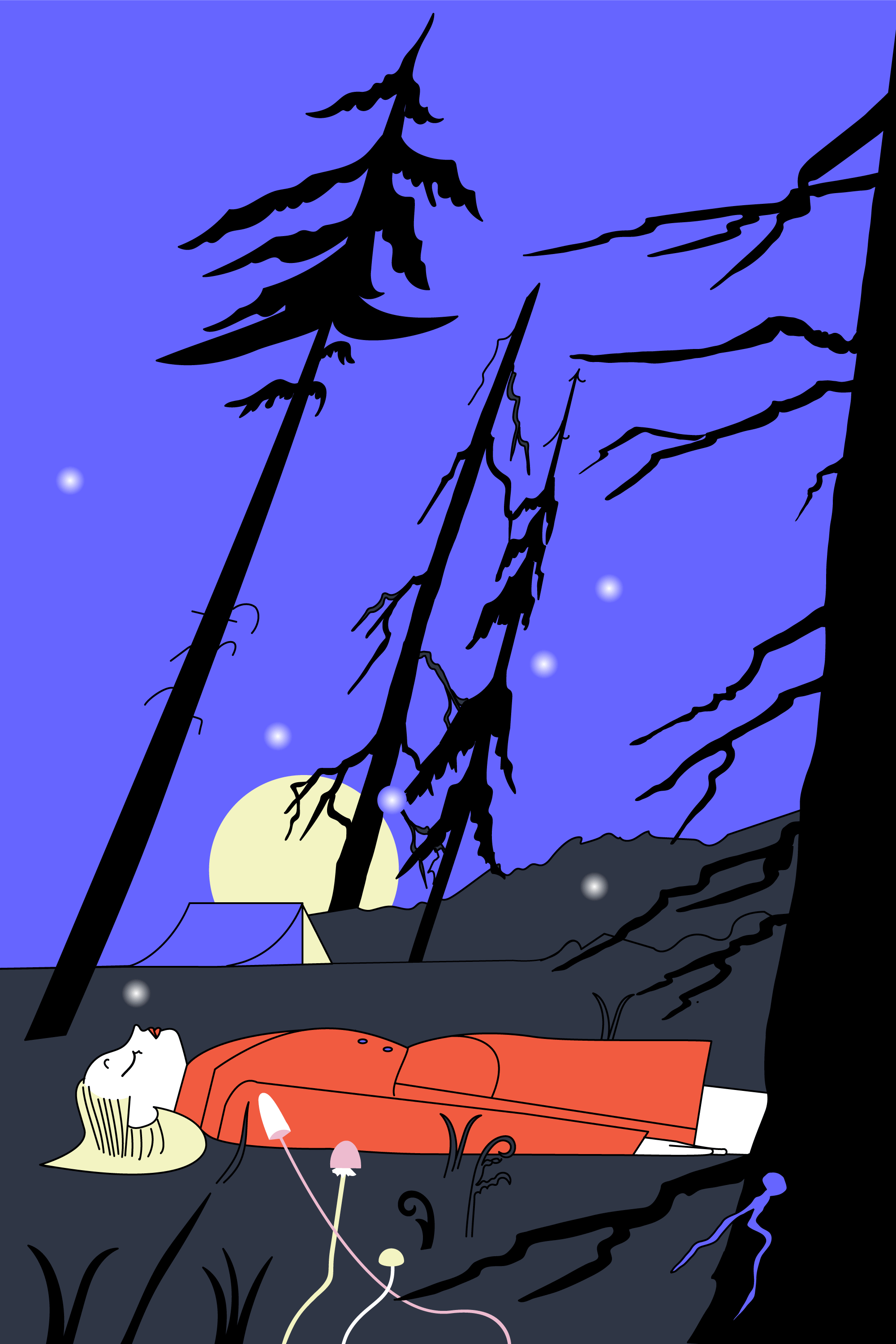 Ich stelle mir vor, wie ich nachts im Zelt wachbleibe, um dem System Zeit zu stehlen, die es mir am Tag stiehlt. Revenge Bedtime Procrastination. Während einer meiner nächtlichen Prokrastinationen habe ich davon gelesen. Wie ich mich auch zwischen Nadelbäumen im Kapitalismus zu behaupten versuche und dabei meinen bettwarm-feuchten Körper in meinem Jugendzimmer erinnere, der stundenlang im Liegen glotzte oder telefonierte, bis er zu fossilieren schien, ihn dann irgendwann der Schlaf holte und mich aus jeder Verbindung riss. Schon da wollte mein Körper Zeit schinden, welche gewinnen. Nachts im Zelt höre ich tierische Schritte und ein Schnarchen von irgendwo, während ich ins Dunkel meiner Zeltspitze starre und endlich still werde, kurz, denn gleich darauf zieht ja doch die Welt ein, gewaltig, ja, bricht das Stille. Von wegen isomattenklein. Und ich stolpere, über Fetzen und Blitze und lose Puzzleteile, über die Toten und Fast-Toten, die mir wieder erscheinen. Denke an die Zeile von Nadja Küchenmeister: „Man kann die Toten nicht vergessen, aber die Toten vergessen uns“. Dabei will ich nur wachliegen, um die Nacht genau zu diesem Gegenraum zu wandeln, der mich endlich freilässt. In dem mich nichts unterbricht und niemand was von mir braucht. Will der Zeit ein Schnippchen schlagen und riskiere den Schlafmangel. So wandeln meine Zweifel entlang der Erschöpfung oder meine Erschöpfung entlang der Zweifel.
