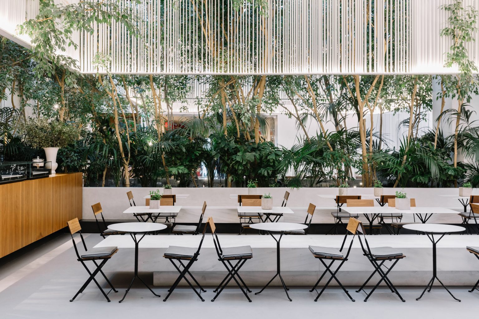 Ganz ohne spektakuläre Grundlage haben Stelios Kois und sein Team dieses Museumscafé umgestaltet: Gelegen zwischen zwei Gebäudeteilen, bot dieser Ort im Museum für kykladische Kunst in Athen ursprünglich wenig Glamour. Auch die spektakulären Ausblicke, mit denen andere Museen in der griechischen Hauptstadt aufwarten, gibt es hier nicht. Und trotzdem gewinnt man dank einer eingelassenen, weißen Struktur, rundherum von Pflanzen gesäumt, das Gefühl von viel Licht und Grün.