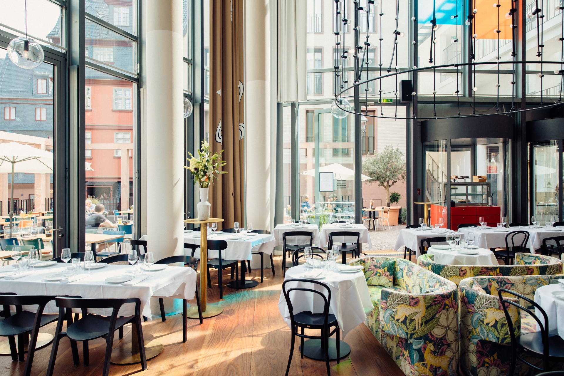 Nur eine gute Zugstunde entfernt befindet sich ein Museumscafé-Kleinod in schönstem Billie Eilish-Grün. Das kam so: 1984 eröffnete der Erweiterungsbau der Staatsgalerie Stuttgart, die Neue Staatsgalerie. Heute gilt das Bauwerk von James Stirling mit seinen markanten roten, grünen, blauen und pinken Applikationen als eines der wichtigsten Beispiele der Postmoderne. In der kann man nicht nur Kunst anschauen, sondern davor & danach auch Pasta, Tabouleh oder schwäbische Maultaschen ordern – im Fresko huldigen nämlich nicht nur die Fensterstreben der farbenfreudigen Architektur, auch der komplette Fußboden ist im Signature-Grün des Bauwerks gehalten, das sich irgendwo zwischen Apfel und Neon, also in etwa der gerade ehemalig gewordenen Haarfarbe des eingangs erwähnten Pop-Stars, verorten lässt. Nach einer halben Stunde Café-Besuch wirkt das merklich auf der Netzhaut nach.