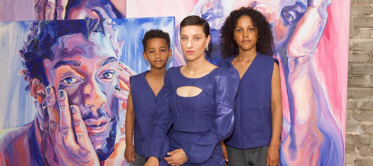 Wir klingeln an der Tür eines typischen Neuköllner Mietshauses. Es dauert einen Moment, bis das obligatorische Surren ertönt. Als wir den Flur betreten, blicken wir in zwei neugierige Gesichter. „Macht ihr heute Fotos von uns?”, fragt Immanuel, dessen lange Locken noch feucht vom Duschen sind. Wie sein jüngerer Bruder Oliver trägt er ein ärmelloses Oberteil aus dunklem Jeansstoff. „Das hat Mama gestern Abend für uns genäht”, sagt der Zehnjährige, als er unsere Blicke bemerkt. „Sie ist noch im Bad, aber gleich fertig.” Die beiden führen uns in einen etwa 20 Quadratmeter großen Raum, der von seiner Bewohnerin sowohl als Atelier als auch als Schlafzimmer genutzt wird. Neben einem Bett und einem Nachttisch, auf dem Bücher über Feminismus, Rassismus und Selbstfürsorge sowie große, strassbesetzte Ohrringe liegen, fallen sofort die großformatigen Bilder ins Auge, deren Farben von Ultramarin über Magenta und Violett bis hin zu zartem Lila reichen. Es sind Porträts von Männern. Akte, die nichts Anzügliches an sich haben. Im Gegenteil: In ihrer Männlichkeit wirken die Dargestellten sanft und nachdenklich. Es ist, als spiegele ihr Blick ihr Innerstes wider.