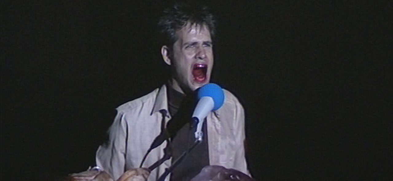 Oder der Besuch von Schlingensiefs wanderzirkusartiger „Church of Fear“ in Frankfurt, der zugleich auch noch den dritten „Internationalen Pfahlsitzwettbewerb“ markierte: -Lose Menschen (Arbeitslose, Konfessionslose, Obdachlose, Ratlose, Staatenlose etc.) sollten wie Heilige auf Pfählen ausharren, dem Geduldigsten wurden 3000 Euro Preisgeld in Aussicht gestellt (Slogan: „Angebot ohne Nachfrage“, „Win with your losers“, „Zugreifen! Arbeitslose kaufen!“). Ganz abgesehen von Schlingensiefs zahlreichen Spielfilmen, beispielsweise der zweite Teil seiner satirischen Deutschland-Trilogie, „Das deutsche Kettensägenmassaker“, die innerhalb weniger Wochen nach dem Mauerfall entstand: Eine Familie von „Wessis“ fängt an der ehemaligen Grenze „Ossis“ ab und verarbeitet sie sprichwörtlich zu Wurst (Slogan: „Sie kamen als Freunde und wurden zu Wurst“).